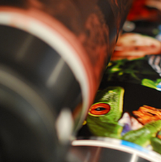 Flexographic printing is a technique that uses a flexible printing plate. The plates are wrapped around cylinders on a web press. The inked plates have a raised image and rotate at high speeds to transfer the ink through small holes onto the substrate; each color requires a different printing plate. Flexo printing adapts well to different materials like thin film, paper, carton board, shrink sleeves, inmould, lamitube and flexible packaging.